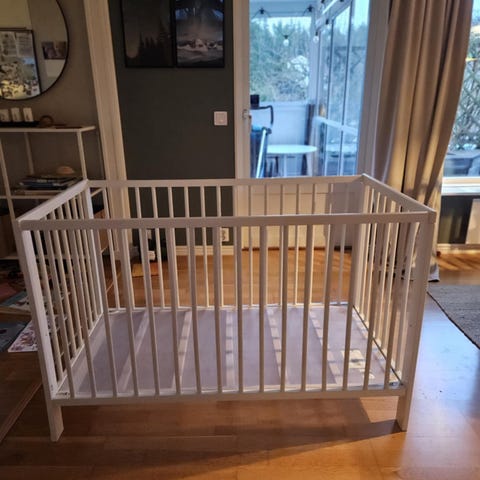 Spjälsäng från Ikea, modell GONATT i grått.