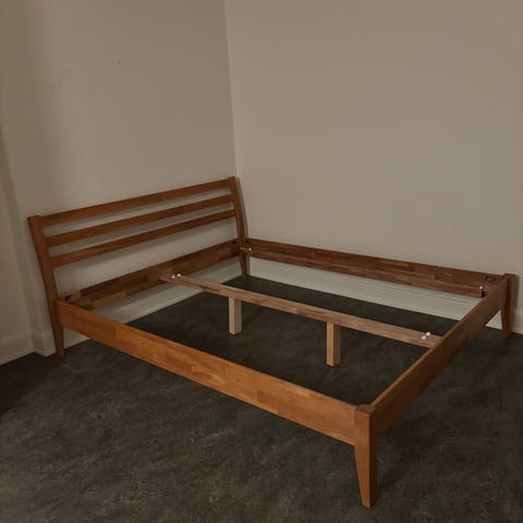 För standard dubbelsäng 180x200 sängram i mörkbrunt konstläder. Ca 10 cm extra åt varje håll.