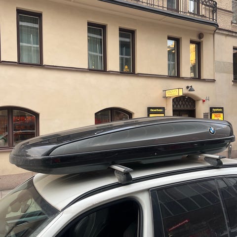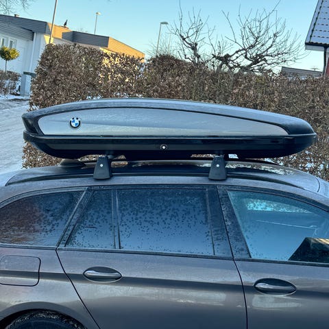 BMW Takbox 520 i svart med titansilverfärgade sidostödkäppor. Låsbar takbox med dubbelsidigt öppningssystem och centrallås med tre låspunkter för säker låsning. Volym på 520 liter. Mått (L x B x H): cirka 2350 x 940 x 410 mm. Vikt 27 kg. Passar till BMW takstolsfästen och är anpassad för BMW 520 modeller.