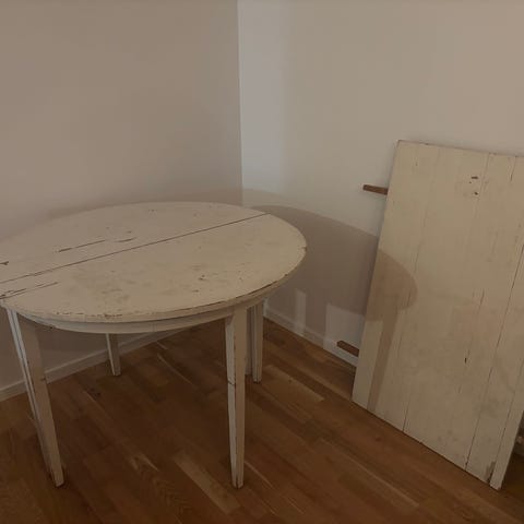 Fint och stabilt köksbord med fiskbensmönstrad bordsskiva och underrede i massivt trä. Bordet har använts dagligen i ett par år och har normalt slitage i form av repor samt färg /pennmärken, främst på undersidan av bordsskivan, från barnens kreativa stunder.