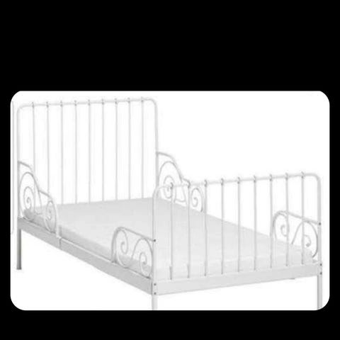 IKEA Minnen juniorsäng med utdragbar sängstomme i vit metall. Sängen har måtten 80x200 cm max, minimum kan sängen vara 130 cm lång. Vi har haft sängen 80x165 cm lång. Sängstommen har ribbotten och är lämplig för barnrum. Stommen är köpt begagnad, och madrassen är köpt ny av oss.