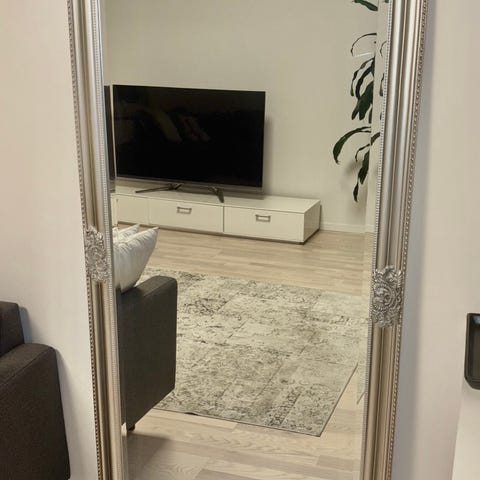 Säljer en spegel med antikliknande ram. Ramen består av folierad MDF och är i nyskick med skyddspappen kvar på baksidan.