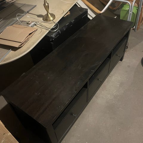 Stor tv bänk med 3 små lådor & 2 stora glas lådor. Har ett hål i mitten som knappt syns.