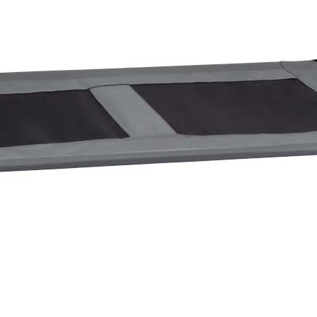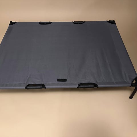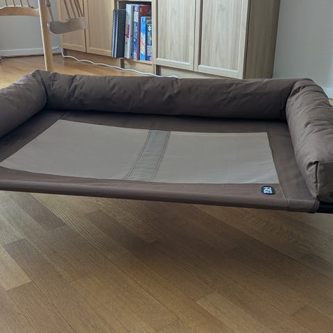 Säljer en upphöjd hundsäng i trä med tygbädd, helt ny och oanvänd, fortfarande i originalkartong.