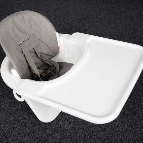 Stokke Steps matstol med babyset. Sele till att spänna fast bebisen- kan ställa in stolen /stolsryggen så den passar från 4 mån. Klädseln är grå/vit med moln. Insatsen är vit och stolsbenen är grå färg. Finns tecken på användning men det är inga större fel på den. Många bra funktioner på stolen och vi har varit nöjda!