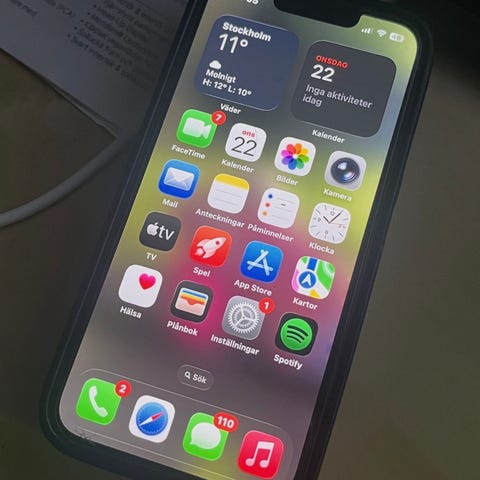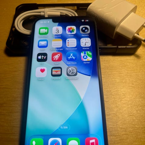Apple iPhone 14 smartphone med 128 GB lagringsutrymme. Enheten är vit till färgen och har en skärm med en liten skada i ena hörnet. Mobilen är avsedd för allmänt bruk och passar användare som söker en enhet med dessa specifikationer.