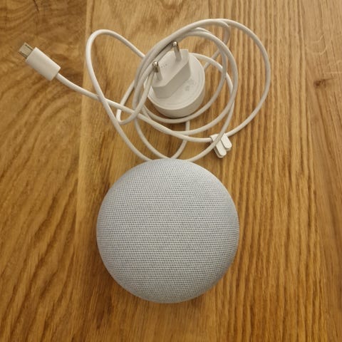 Google smart högtalare i grå färg med tillhörande laddare. Produkten är avsedd för ljuduppspelning och röststyrning.