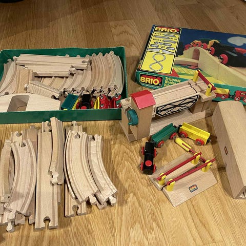 Tågbana BRIO med fordon, byggnader och figurer. Totalt 240 delar