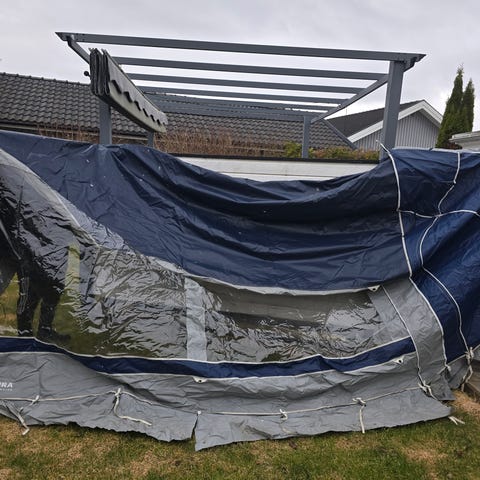 Komplett förtält för vintercamping i svart och grått. Förtältet har stora fönster med gardiner. Materialet är vädertåligt och designat för att ge skydd och extra utrymme under vintercamping.