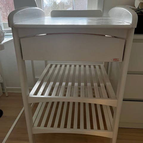 Ett snyggt och praktiskt skötbord i stilren design från JLY. Skötbordet har höga kanter som försäkrar att ditt barn inte rullar av. Skötbordet har två hyllor och en utdragbar låda där du kan förvara våtservetter, salvor och andra saker som kan vara skönt att ha nära till hands.