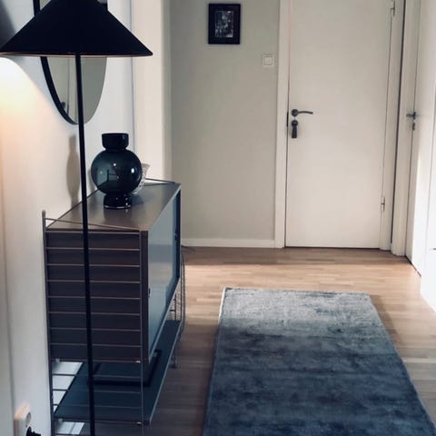 Jättefint hyllsystem från String, total bredd ca 234 cm (tre sektioner a 78 cm). Höjd 85 cm och djup 30 cm.