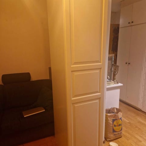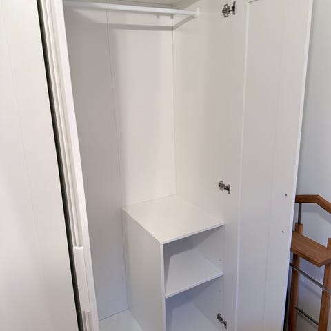 IKEA Garderob med tre dörrar i vit färg. Garderoben har en enkel design med plats för hängande kläder och förvaring. Observera att garderoben har synliga skador på ytan, inklusive sprickor och slitage på dörrarna och nederdelen. Passar för användning i sovrum eller förvaringsutrymmen där en enkel garderobslösning behövs.