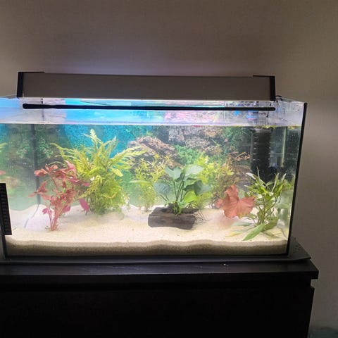 Akvarium 60 L. 35Hx30D+60B. Med BTN bakgrund. Doppvärmare Jäger 50W. Filter Eheim Typ 2412020 Biopower 200. Belysning är IKEA Led. Varit tömt ett tag. Men har fyllt det igen och kontrollerat att det inte läcker.