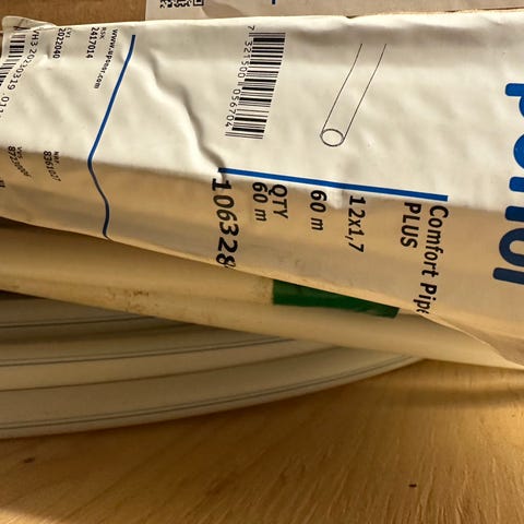Uponor golvvärmeslang, Comfort pipe plus, 17mm. 117 meter för spårad spånskiva. 2500kr.