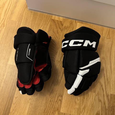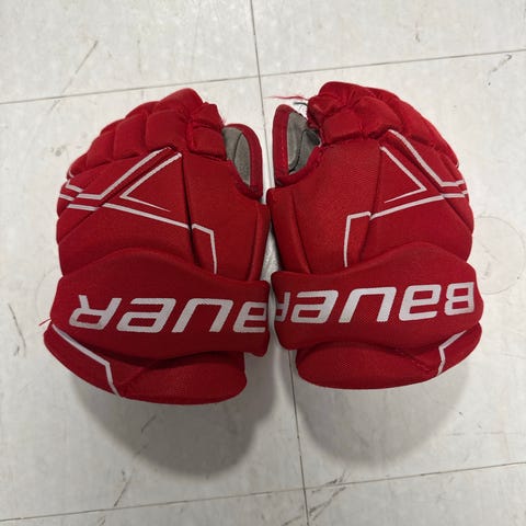 Bauer Vapor X500 hockeyhandskar i storlek 13 tum. Handskarna är svartvita med röda detaljer och är avsedda för användning inom skridskosport. Material och design är anpassade för skydd och rörlighet under hockeyspel.