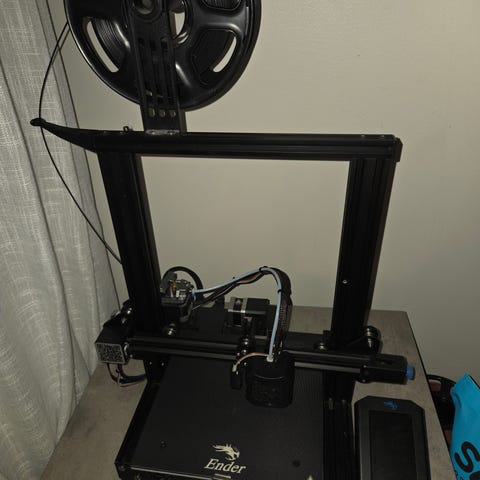 Ender 3 3D-skrivare i svart färg. Utrustad med en LCD-skärm och en byggyta för utskrifter. Används för tillverkning av tredimensionella objekt genom lager-på-lager utskriftsteknik.