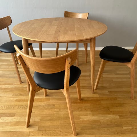Matgrupp med 6 stolar i mycket fint skick. Två iläggskivor på 50 cm vardera medföljer med plats för upptill 12 personer