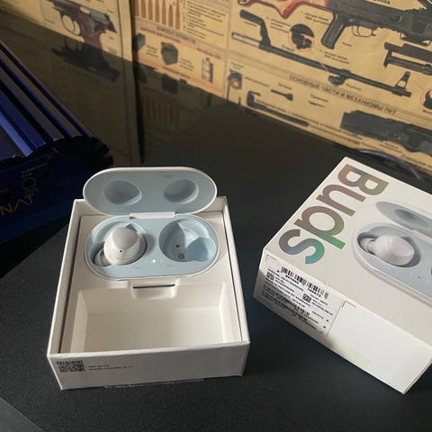 Samsung Galaxy Buds trådlösa in-ear hörlurar i vit färg. Inkluderar laddningsfodral, dubbla uppsättningar av alla storlekar på öronproppar och vingar, förutom large som har en uppsättning. Levereras med laddningskabel och användarmanual.