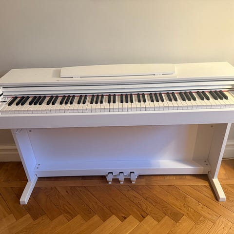 Yamaha Piaggero NP-12 vitt digitalpiano med ett kompakt och portabelt utförande som ger en realistisk pianokänsla vid nedslag och 61 tangenter. Utrustad med olika ljudinställningar och anslutningsmöjligheter inklusive hörlursutgång och förstås också för inspelning. Passar för både nybörjare och lite mer erfarna pianister. Metronomen kan hjälpa till att hålla takten och en del inspelade stycken finns att lyssna på. Hög kvalitet. Bra stativ, mothållet och elsladd medföljer förstås.