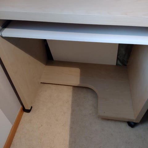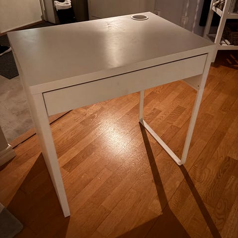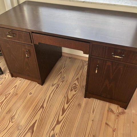 Skrivbord i trä med tre lådor och extra utrymme under bordsskivan, ej utdragbart.