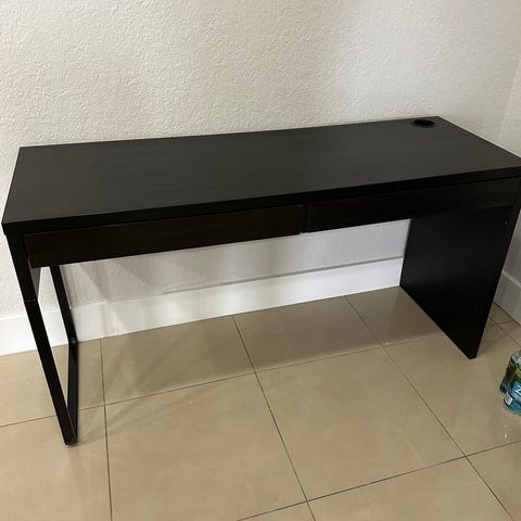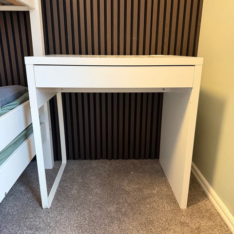 IKEA skrivbord i vitt med måtten 73x50 cm. Bordet har en rektangulär form och inkluderar en utdragbar låda under bordsskivan. En kabelgenomföring finns på bordsskivan för hantering av sladdar. Passar för användning som arbets- eller studieplats.