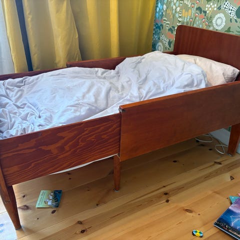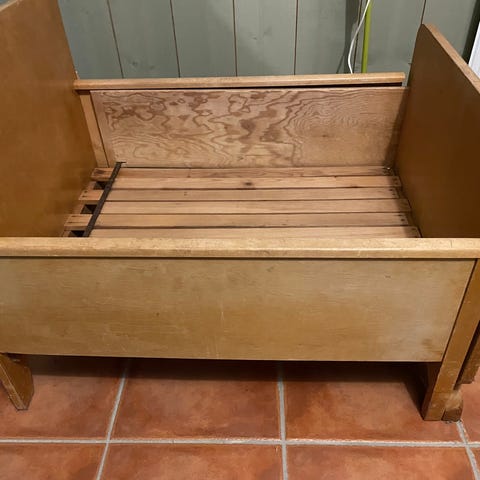 Retro barnsäng från gissningsvis 60-tal. Avtagbara långsidor och kan även användas som soffa. Madrass med madrasskydd medföljer. Längd 173, höjd 72, djup 70 cm.