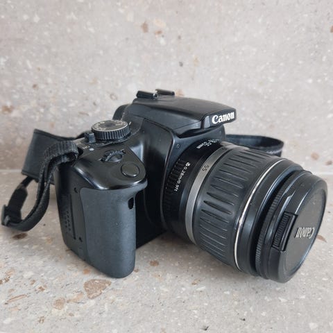 Canon EOS 400D systemkamera med standardobjektiv. Användbar för fotografering i olika miljöer och för olika ändamål.