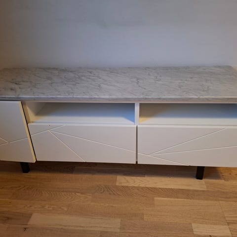 En liten skada framtill på möbeln, se sista bilden, samt högra stora luckans push to open beslag har gett upp.