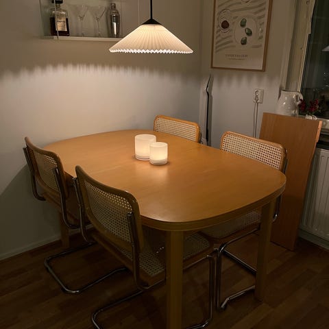 Bordet är 190 cm långt och blir 240 cm med iläggsskivan.