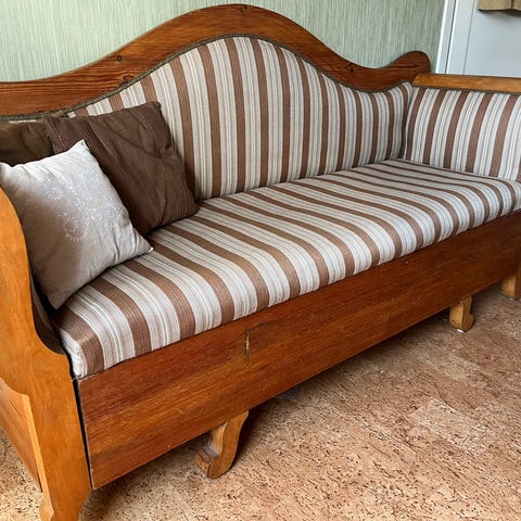 Antik nyklädd Karl Johan soffa. Går att ta isär och enkelt frakta. Stoppningen är hel och felfri. En liten fläck. Har ej provat ta bort den. Längd ca 200-205cm.