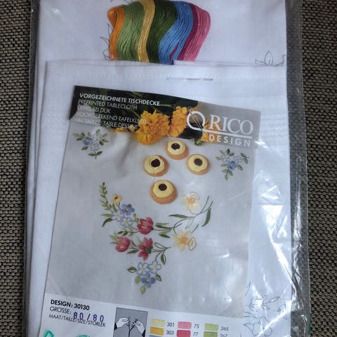 Marks & Kattens duk med broderikit inklusive garn i flera färger. Mönster och instruktioner för broderi med motiv av blommor och juldekorationer. Dukens storlek är cirka 114 x 114 cm. Material och kön specificeras inte.