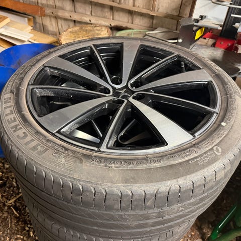 Har en uppsättning Polestar original 19tum med Nokian Hakkapelitta R5 EV med ca 7mm mönsterdjup kvar på bakdäcken och 5-6mm för framdäcken.
