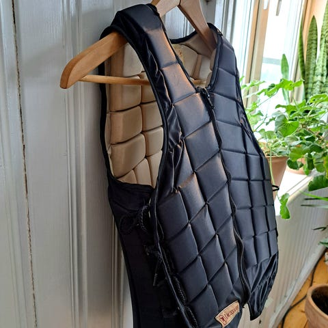 Hooks EX01 skyddsväst för barn i storlek XL. Västen är mörkblå och är designad för att ge skydd vid ridning. Den uppfyller BETA 2000 nivå 3 standard för kroppsskydd och har justerbara remmar för en säker passform.