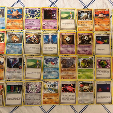 Pokémon samling kortspel med över 140 olika kort. Kortens framsida och baksida visas, innehåller olika Pokémon-figurer och typer. Kortens skick och exakta utgåvor varierar.