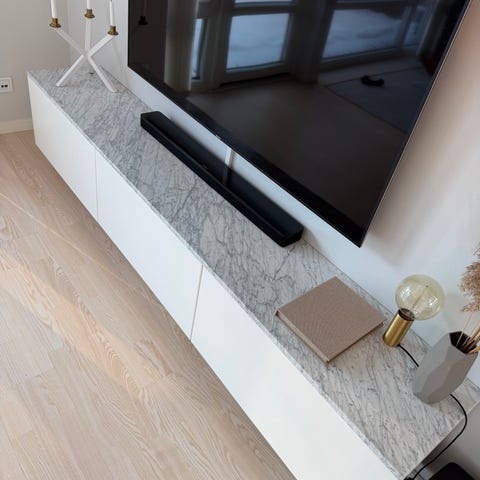 Tv-bänk med egengjuten grå betongskiva & svetsade metallfötter.