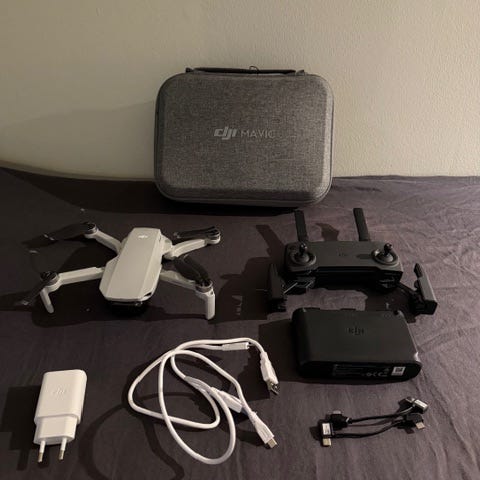 DJI Mavic drone set inklusive drönare, fjärrkontroll, tre batterier, laddningskablar och förvaringsväska. Setet är avsett för användning inom flygfotografering och videoinspelning. Material och färg är grå och svart. Innehåller flera tillbehör för att möjliggöra laddning och kontroll av drönaren.