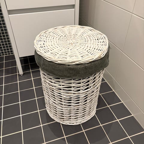 Flätad tvättkorg med lock i naturmaterial. Fyrkantig form med vit textilfoder inuti. (59x41 cm)