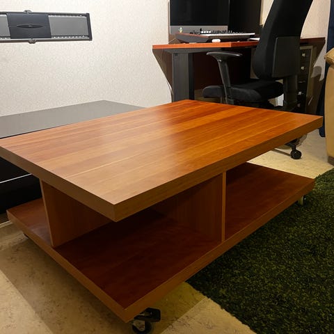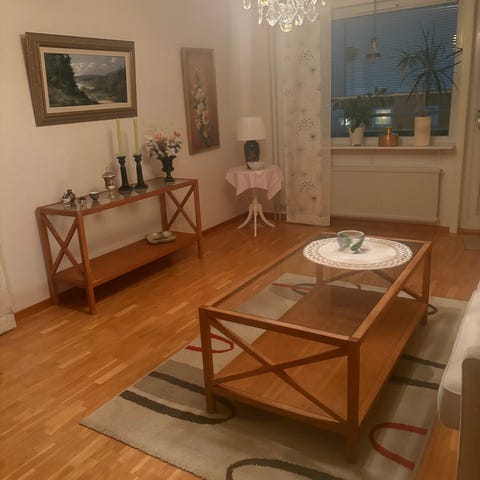 Fint soffbord i massiv ek. Finns i centrum, 3 våningar utan hiss. Mått: diameter 79 cm, höjd 50 cm.