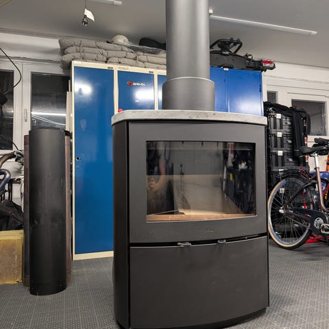 Säljes till kanonpris mot att man kommer och själv monterar ner den. Skorsten och allt som tillhör ingår (förutom golvplåten som syns på bilden, den har vi inte kvar längre). Vi bor i ett 1,5-plans hus så rör för en övervåning ingår också.