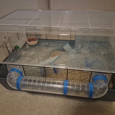 Litet märke till vänster i träet på locket, se bild. I övrigt fint skick. Varit toppen för våra 2 dvärghamstrar med gott om utrymme för tjockt spånlager.
