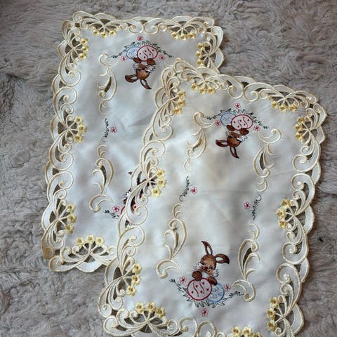 •Duk 50×50cm, ritat på bomullsväv, med påsydd spets. OBS! UTAN GARN. Korstygn och stjälkstygn - 70 kr