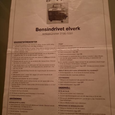 Spänning 230V, kontinuerlig 2,3kVA , Max 2,6kVA ,batteriladdning 12V/8,3 A , ström uttag 2x230V, motoreffekt 3,3kW/4,5hk, blyfri 95okt, driftid 4h, liten skada ena sidan