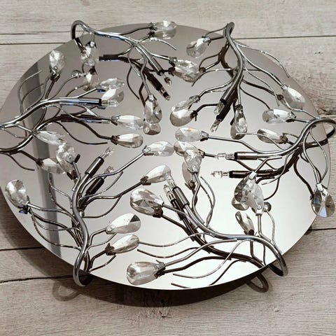 Elegant taklampa med guldfärgad stomme och vackra kristaller. Perfekt för att skapa en lyxig känsla i hemmet.