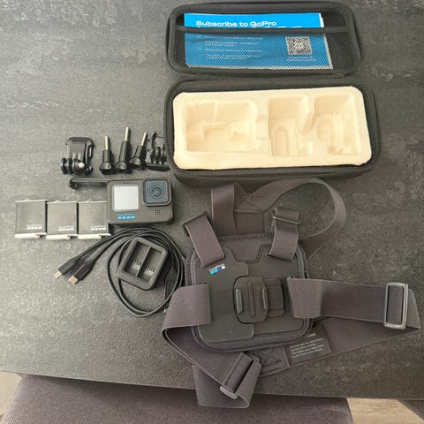 GoPro tillbehörspaket innehållande olika fästen, fodral, kablar och andra tillbehör för kameraanvändning. Paketet inkluderar bland annat handledsfäste, olika monteringsclips, förvaringsväskor samt laddnings- och anslutningskablar. Passar för användning med GoPro-kameror och erbjuder olika monterings- och förvaringslösningar.