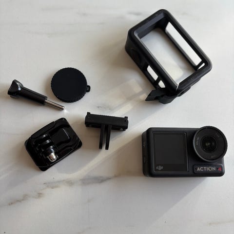 Fäste för att ha kameran på bröstet och fram på hakan på mx hjälm. Även en hand kontroll för att sätta på och av kameran, spela in alltså. Smidigt att ha de spännet med kardborre på handleden och slippa klicka fysiskt på kameran. Massa tillbehör som ni kan se på bilderna. Skickar med PostNord efter betalning.