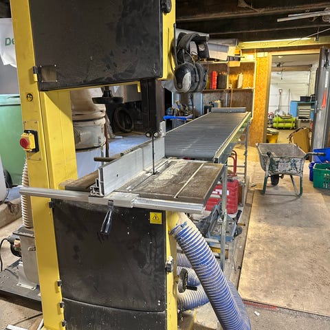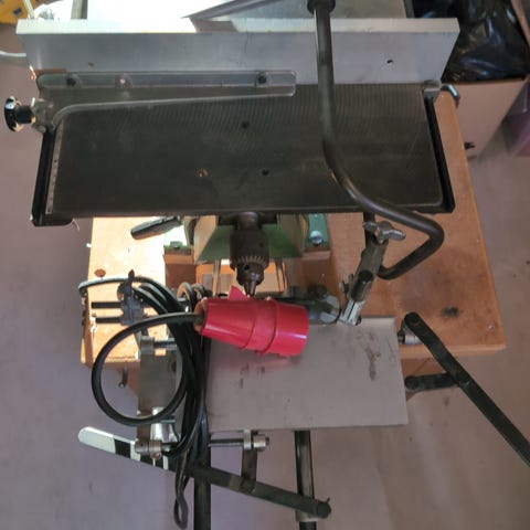 Maskinen är fullutrustad med skjutbord samt tapp- och fräsborr.