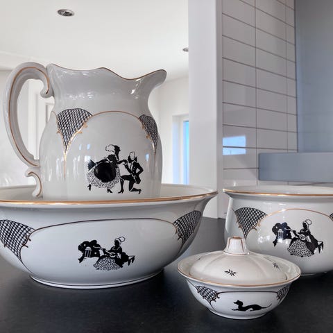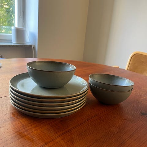 Säljer 7 matallrikar, 7 muggar & 6 djupa skplar i mörkgrå färg. Servisen är tillverkad i keramik och lämpar sig för vardagligt bruk i köket. Märket är Mariehult