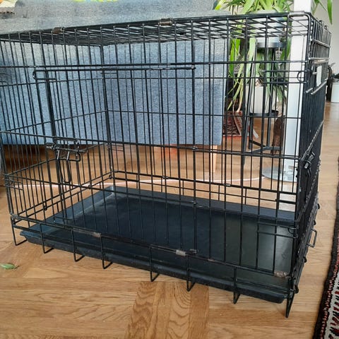 Trapetsformad bur av plastöverdragen metalltråd. Utdragbar golvbricka av tålig ABS-plast, som enkelt spolas av vid rengöring. Buren har två luckor och fälls ihop till ett platt paket genom att dra gavlarna uppåt och fälla in dem. Mått 77 x 47 x 54 cm Mått 39,5 x 39,5 cm (framlucka) Mått 39,5 x 37,5 cm (baklucka) Vikt 6,8 kg Endast avhämtning gäller, fraktas inte.