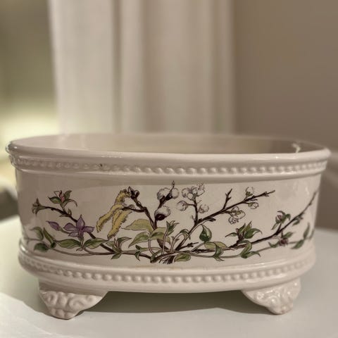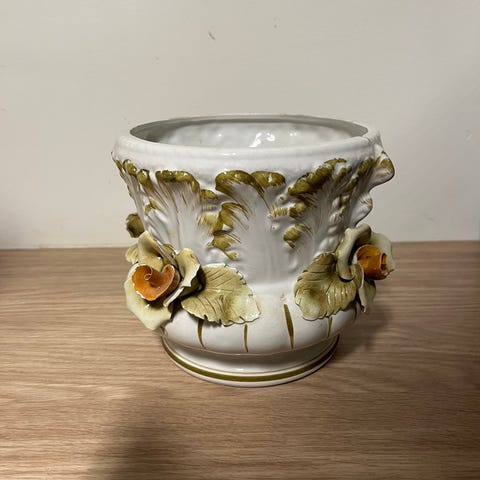 Uppsala Ekeby blomkruka i porslin med mönster av rosa rosor och guldkant. Krukan har en vågig kant och är vit med dekorativa blommor, lämplig för inomhusbruk.