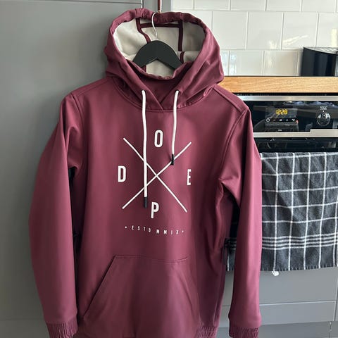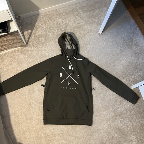 Det är skidkläder från dope (15 000 i både andning och vattenpelare). Mörkgrön färg både på hoodien och byxan.